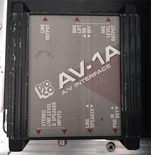 Direct Boxes: We have three Pro Co's AV-1 Audio/Video Interface which allows for clean, worry free transfers of line or speaker-level audio from movie projectors, audio and video tape cassette recorders, phonographs and more. These sources can then be connected to the microphone inputs of house or portable PA systems for a variety of uses. Uniquely designed for stacking or side-by-side strapping together, the rugged and durable AV-1 offers all necessary connections and controls to make a quick transfer from low to high-quality sound. Manual